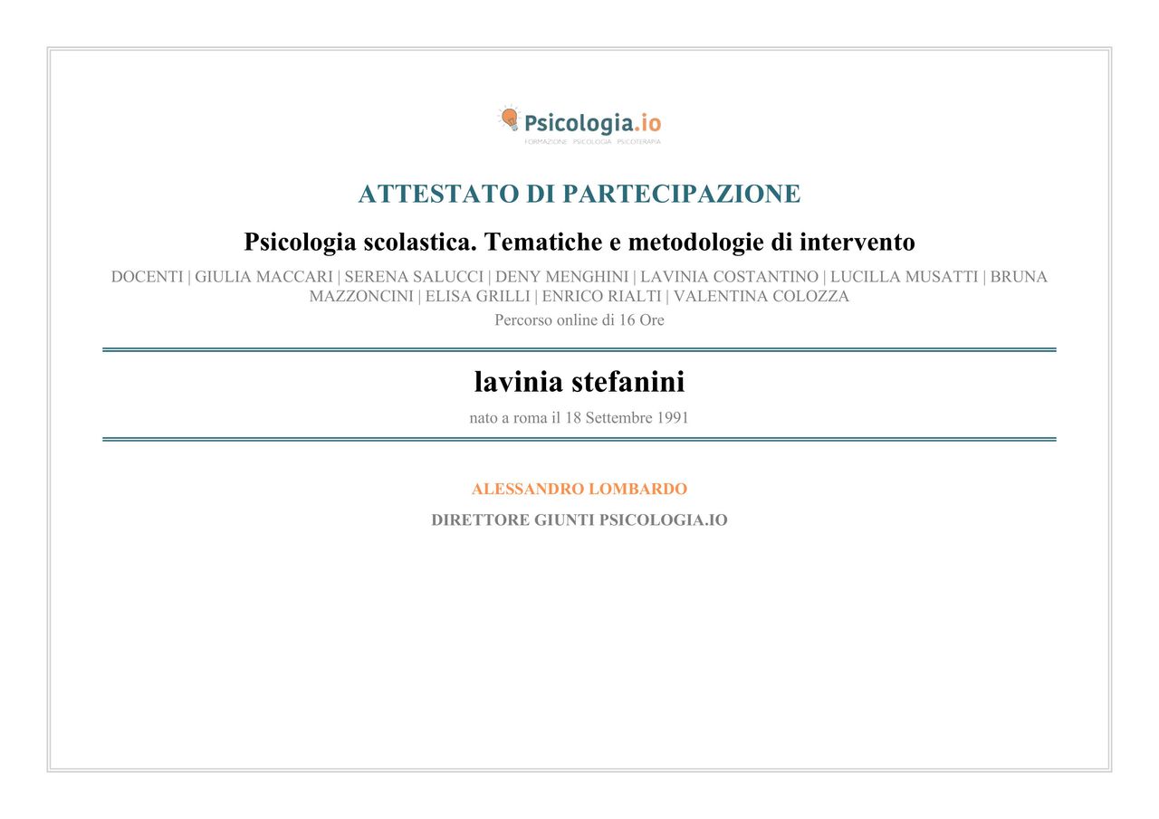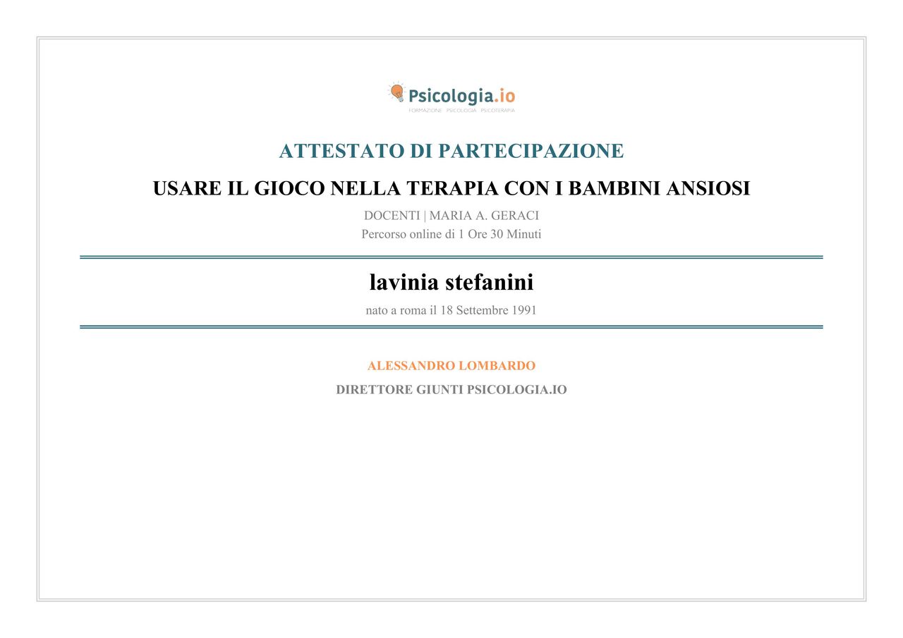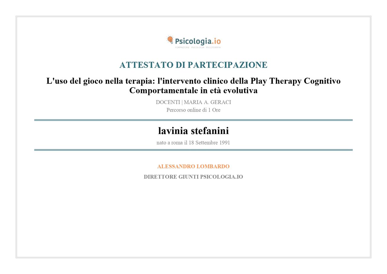 Mi sono formata nell'ambito della psicologia della salute e specializzata nella psicopatologia dell'età adulta e dello sviluppo. Ho acquisito esperienza clinica presso l'Istituto di Neuropsichiatria Infantile del Policlinico Umberto I di Roma, nell'ambito della valutazione psicodiagnostica dell'infanzia e dell'adolescenza, del parent training e del supporto psicologico e genitoriale.